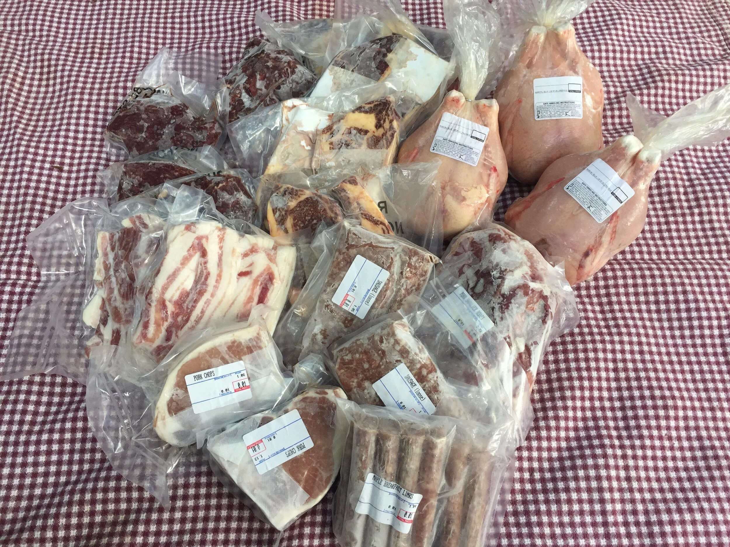 Our meat shares come in two sizes. They each contain 1/3 Chicken, Pork, and Beef. Each half share will have two packs of prime cuts (bacon and/or steak) and the rest a mixture of cuts . For examples of the cuts we have to choose from please refer to the Meat order page. Meat shares are available once a month at Ft. Bacon farm.