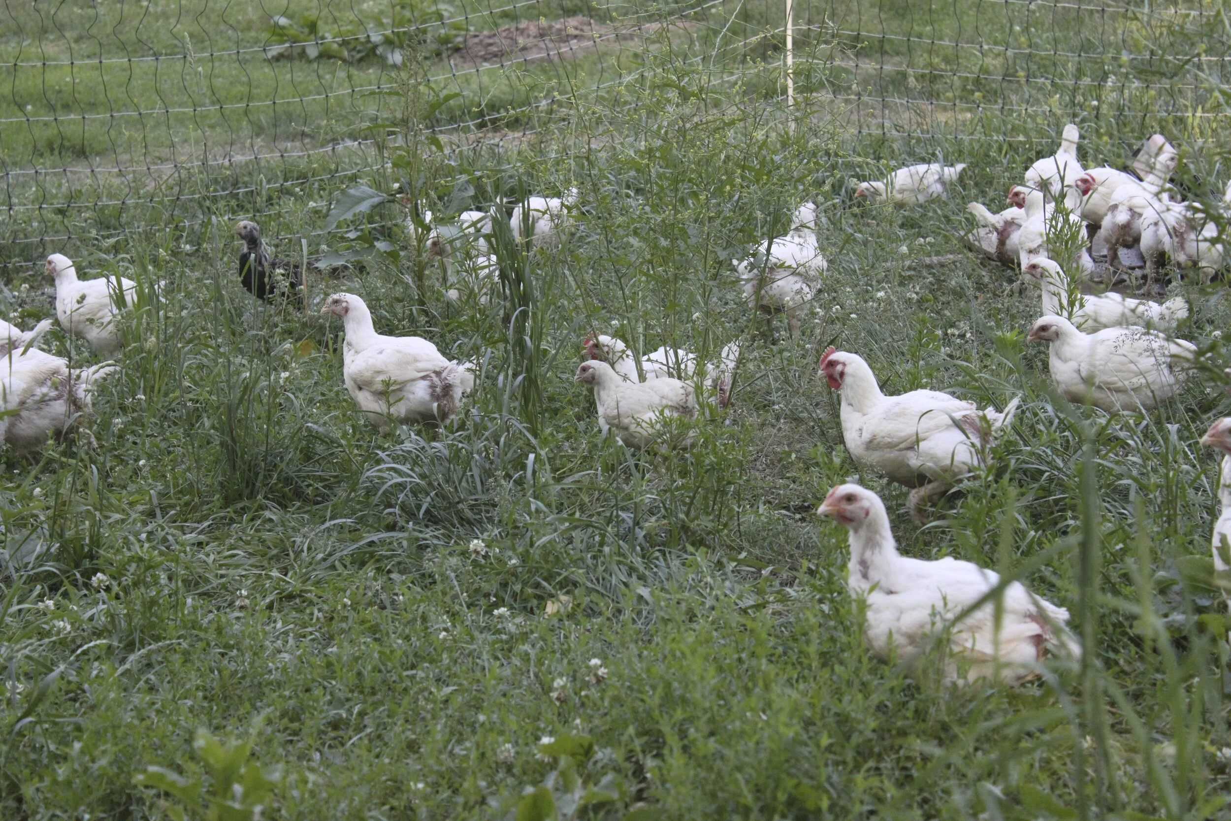 Our chickens begin life in our warm brooder and when they are old enough they start roaming out onto our pasture. In addition to eating grass and bugs, we also fed them Organic, Soy Free, NON GMO grains with vitamins and minerals. They are humanely harvested here on our farm.